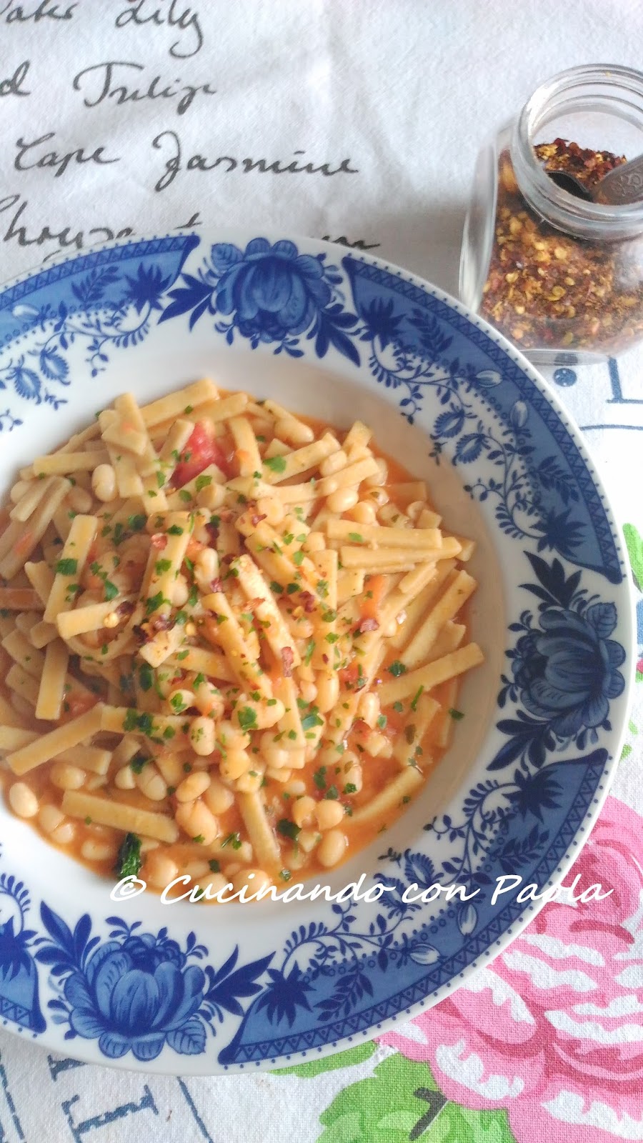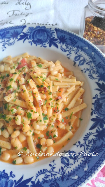 Per me i Fagioli Tondini di Gradoli basterà solo 1 ora o 1 ora e mezzo in ammollo dopo averli lavati per bene sotto l’acqua corrente; cambiare l’acqua e metterli a cuocere per 45 minuti. Invece i fagioli Borlotti circa 2 ore. Saliamo a fine cottura per evitare che la buccia si staccherà e la polpa diventerà dura. Il giorno seguente prepariamo il sugo: in una pentola fate rosolare lo spicchio d’aglio con due cucchiai d’olio, eliminate l’aglio e aggiungete i pomodori pelati a pezzetti, salate e lasciate cuocere a fuoco medio per 2 minuti. Ora aggiungete i fagioli e qualche mestolo di brodo vegetale in modo da coprire un po’ i fagioli. Lasciate cuocere per 3-4 minuti a fiamma media. Se il sugo si asciugherà aggiungete altro brodo. Ora mettiamo la pasta direttamente nella pentola del sugo di fagioli, mettiamo due-tre mestoli di brodo e portiamo a cottura la pasta per 3 minuti (per la pasta fatta in casa), per me le Sagnette di Saragolla 6-7 minuti. Servite con prezzemolo tritato e peperoncino e sopratutto brodosi. Buon appetito!