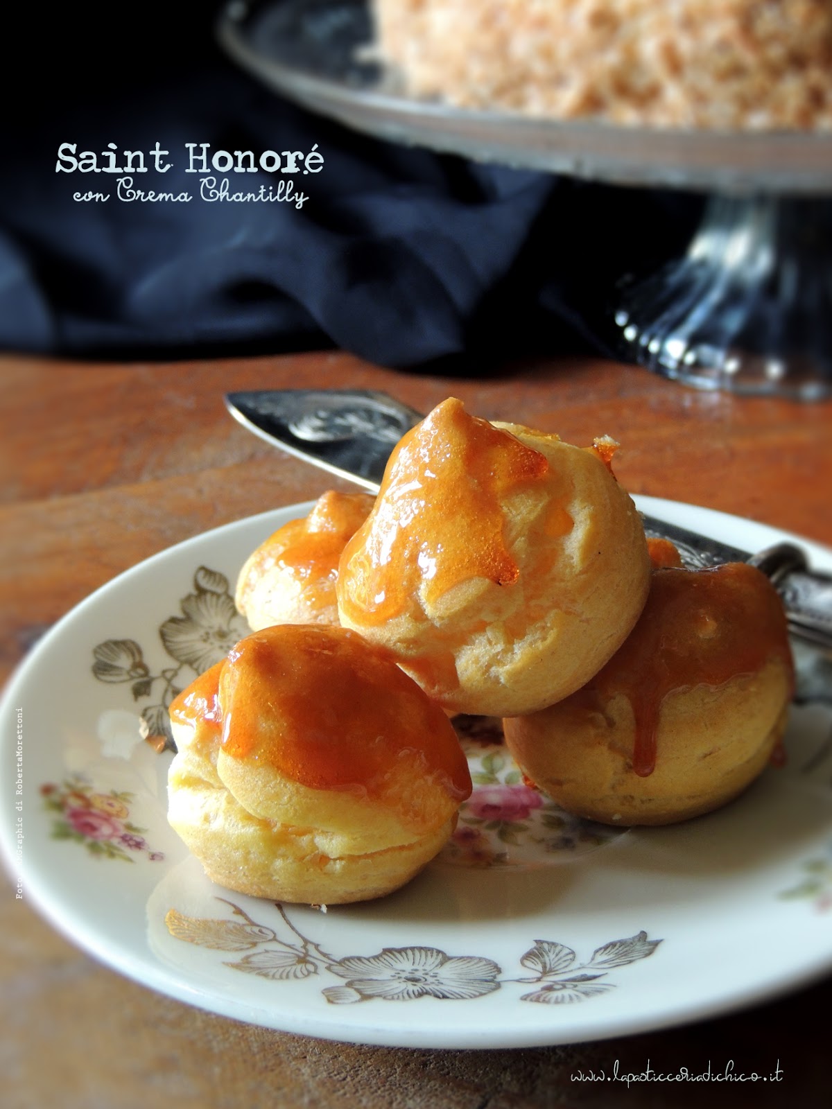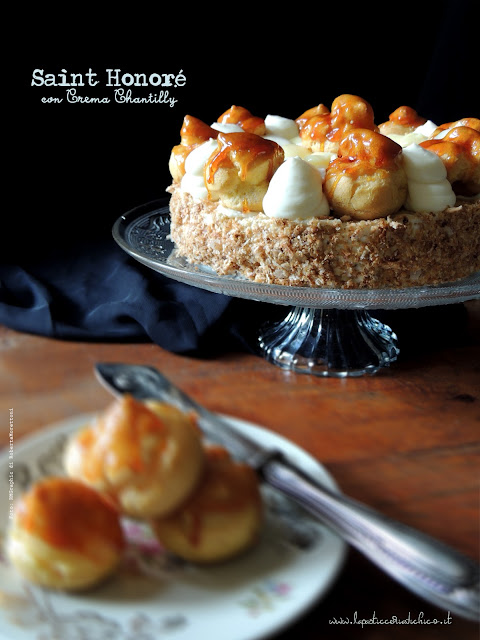In questo caso ho preparato un Saint Honorè con crema chantilly, che prevede una base di pasta sfoglia e pan di spagna bagnato con bagna al Grand Marnier.
