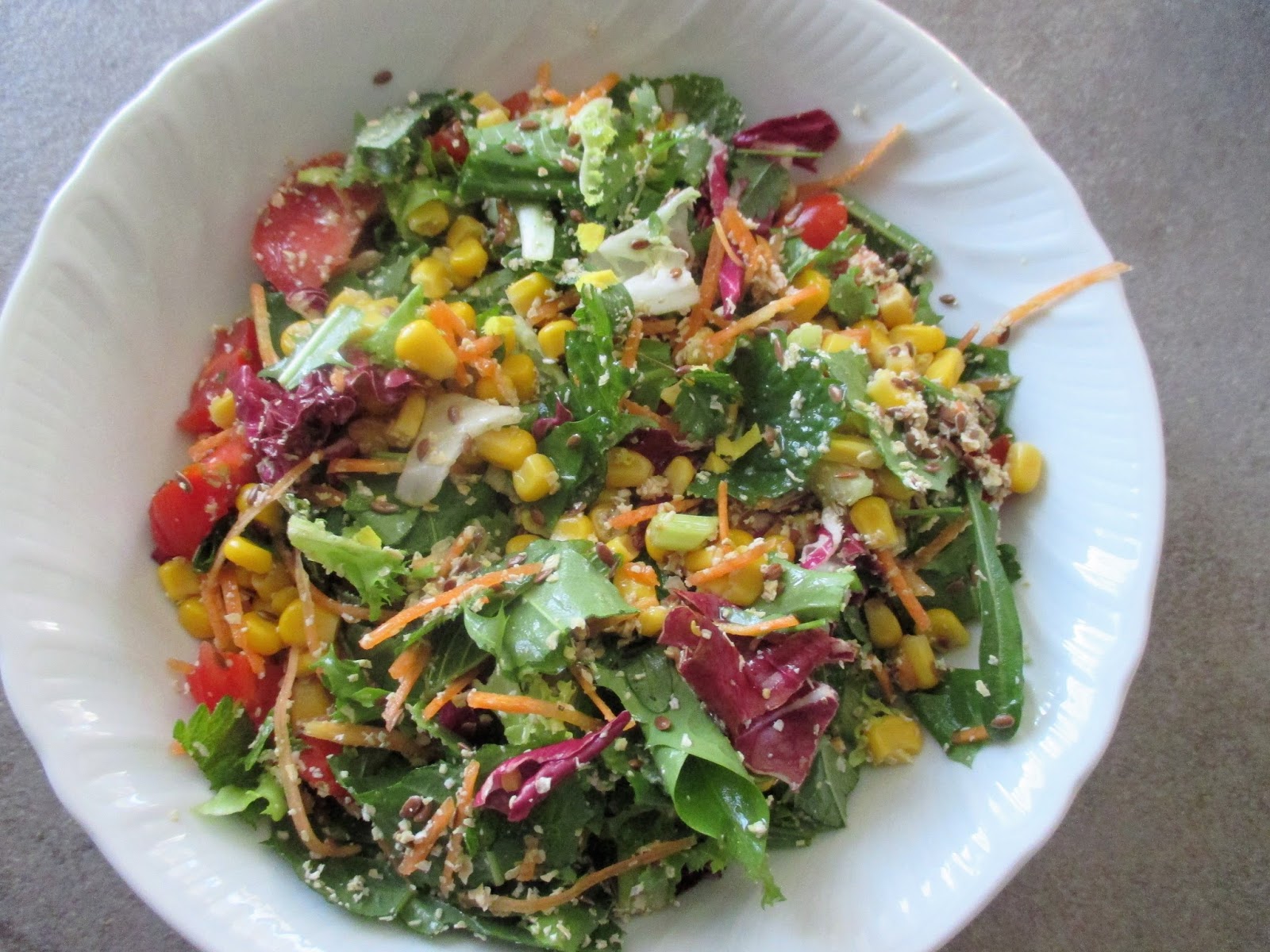 Un piatto pieno di “salute” con frutta secca e verdure per il quotidiano benessere del nostro organismo. Colori e sapori. Percezioni: acidità (lime, pomodori), freschezza (lattuga), piccante (rucola), croccante (carota, noci, semi di girasole, semi di lino)), dolcezza (mais), amaro (radicchio)