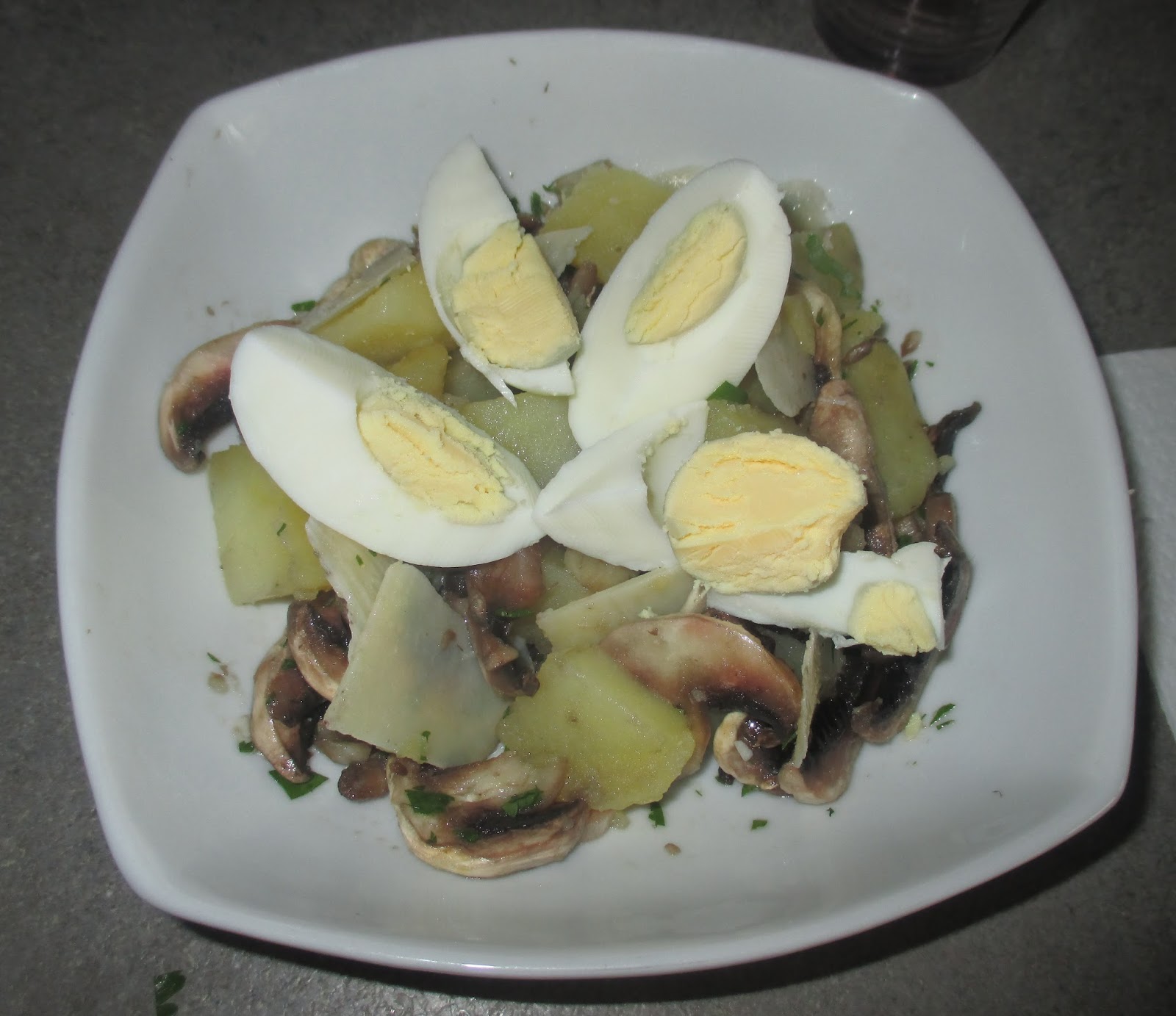 A salad of mushrooms and potatoes boiled eggs which is fine winter, perhaps after a long day at work and you do not really want to cook. To try.