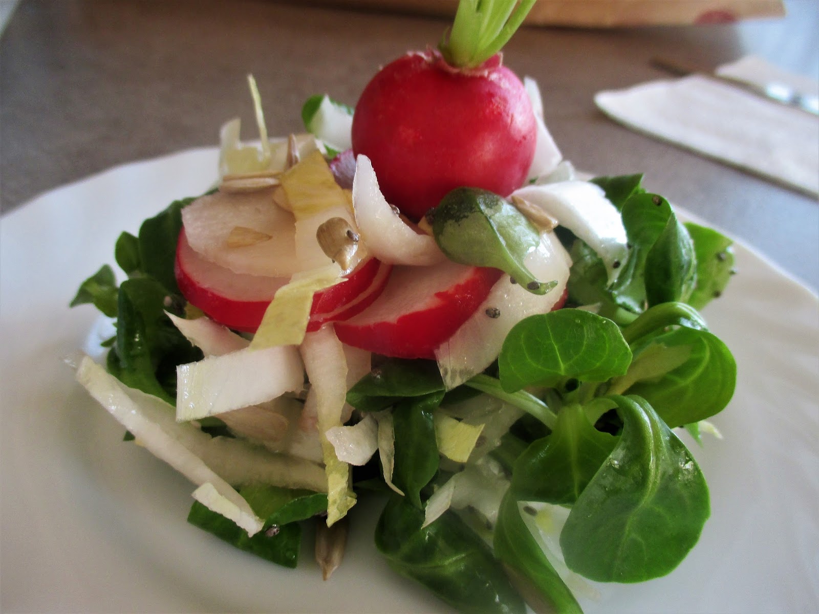 Peel the vegetables, wash them and then cut them carefully and place in a salad bowl. United linseed then seasoned with sesame oil and vinegar. Add salt and serve immediately.