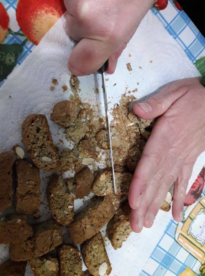 Mescolate gli ingredienti con una frusta elettrica; il composto deve risultare cremoso. A questo punto sminuzzate i cantucci.