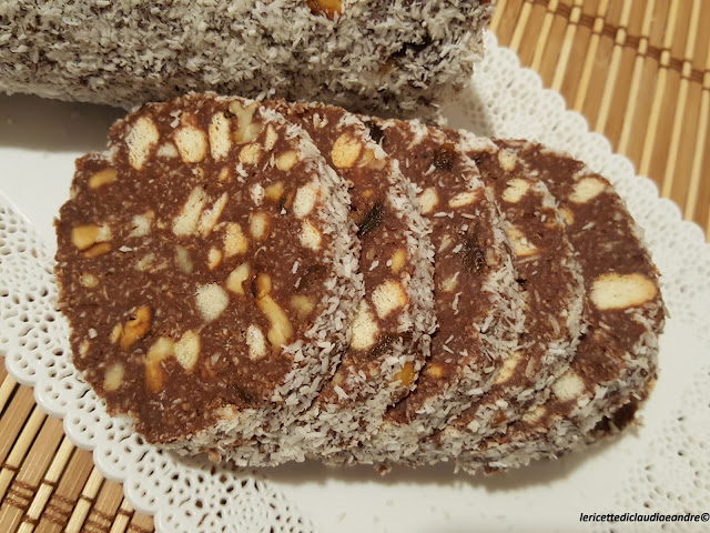 Ancora una volta i vari pachi di biscotti iniziati e che stavano lì che qualcuno li mangiasse, ma non si trovavano dei volontari, a fatto si che si trasformassero in un dolce goloso. Cosa si poteva fare di meglio se non un salame dolce al cioccolato. E’ facile da fare e dura anche per giorni nel frigo o perché no, anche nel freezer, avevo provato in passato e si è mantenuto molto bene. Arricchiti con cioccolato, noci, uvetta e cocco, la trasformazione è stata alla grande. Un ottimo riciclo da gustare in ogni momento della giornata.
