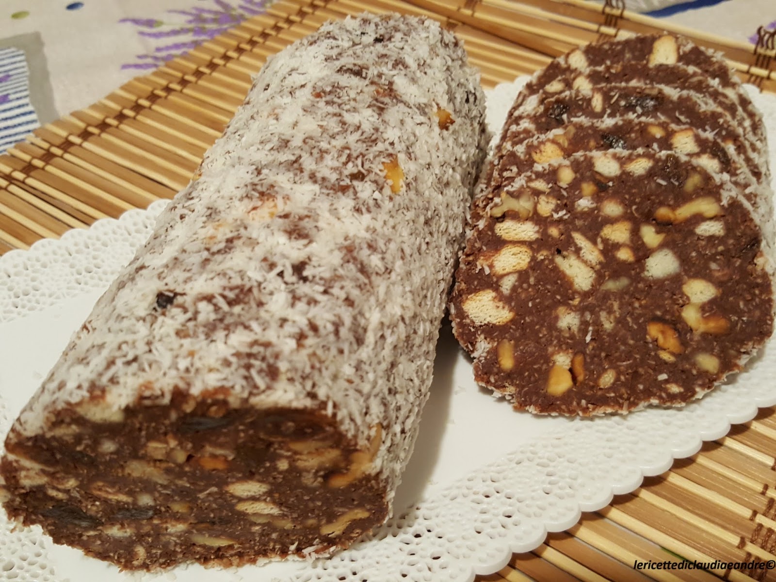 Salame al cioccolato con noci, uvetta e cocco, senza uova