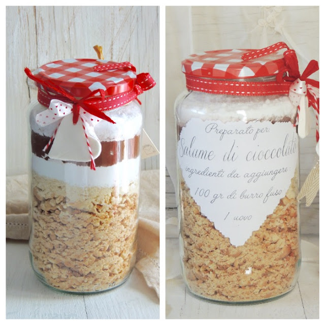 - Chiudete il barattolo con il coperchio/capsula nuova e rifinite a piacere con fiocchi e nastri e naturalmente con l’etichetta, che dovrà contenere anche gli ingredienti da aggiungere per preparare il salame di cioccolato. In questo caso 100 gr di burro fuso e un uovo da amalgamare al resto degli ingredienti in barattolo.