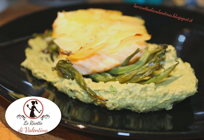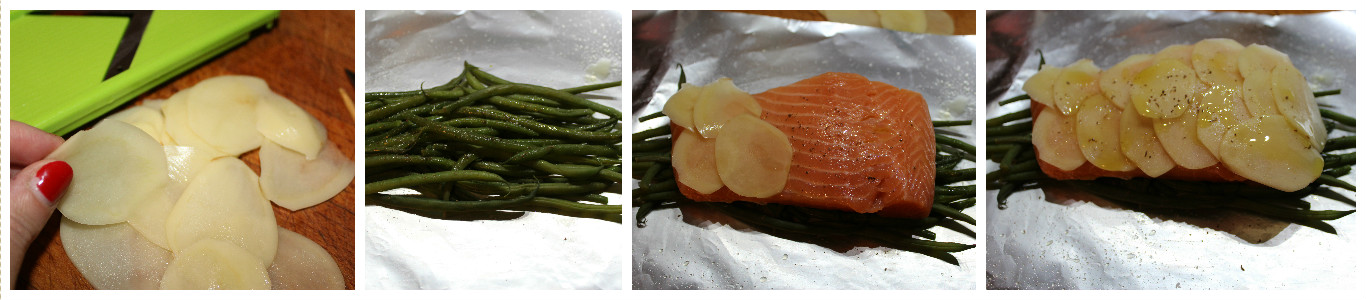Sbucciate e lavate la patata, affettatela finemente con una mandolina. Stendete un foglia di carta stagnola sul piano di lavoro, ungetelo con un goccio d’olio e fate un letto di fagiolini. Conditeli con sale e pepe, adagiate sopra il filetto di salmone, condite anch’esso con pepe, sale e un filo d’olio. Ricopritelo con uno strato di fettine di patata che andranno condite anche loro con sale, pepe e il restante olio.