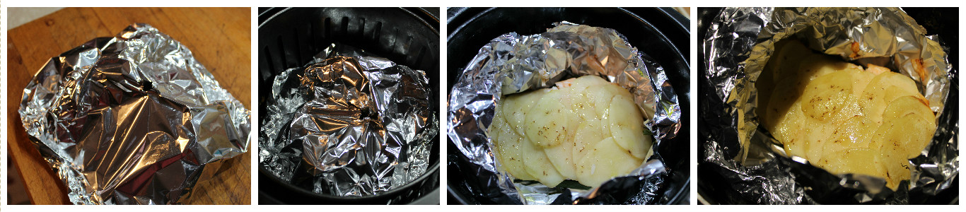 Chiudete la carta stagnola formando un pacchetto ben sigillato ma morbido, non stretto intorno al pesce, sistematelo nel cestello della friggitrice e fate un buchino al centro strappando la carta per creare una sorta di camino. Cuocete per 20 minuti a 200° poi aprite il cartoccio e procedete per altri 10 minuti così da abbrustolire le patate per bene.