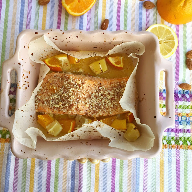 Questo è un’altro di quegli abbinamenti dai quali riesco difficilmente a discostarmi, il salmone con gli agrumi e le mandorle.
