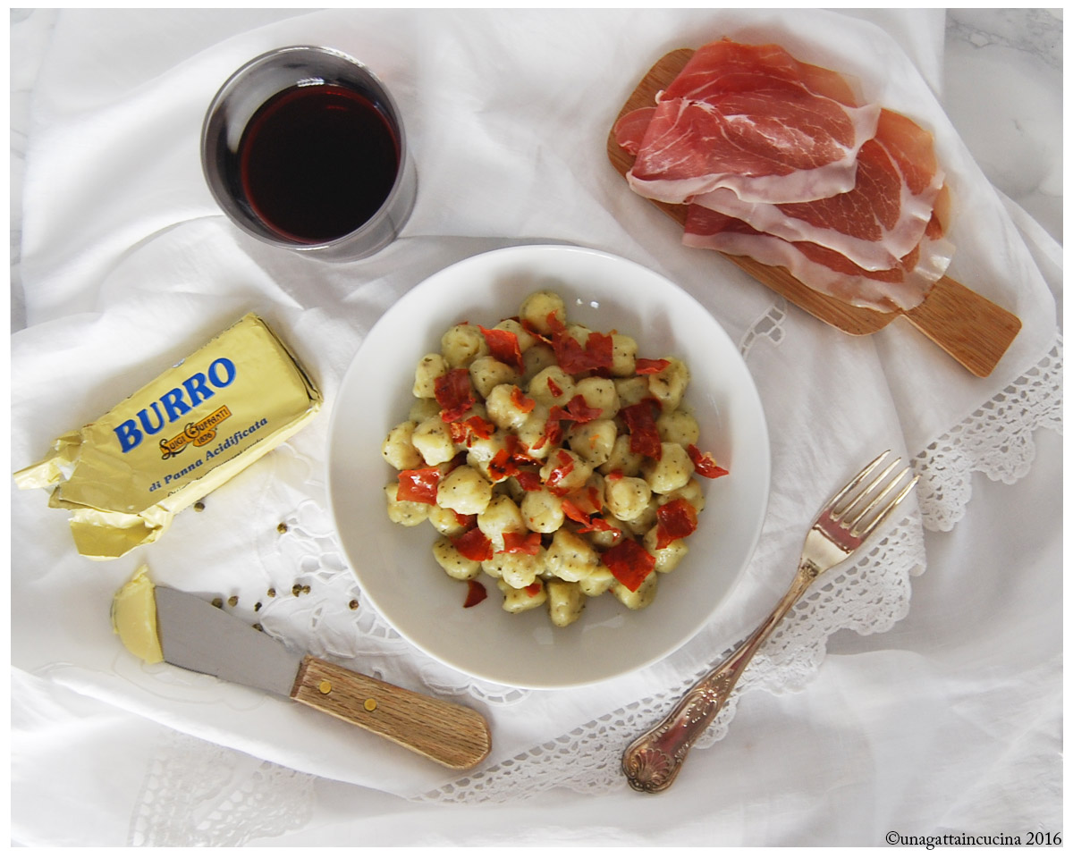 Scolateli e conditeli con i petali di prosciutto croccante, il burro e una generosa grattata di pepe nero.
