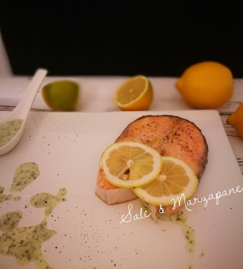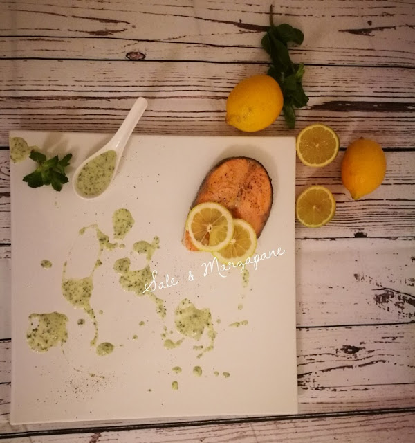 In una padella antiaderente ben calda nella quale avete aggiunto un filo d’olio evo scottate il salmone da entrambe i lati ed aggiustate di sale e di pepe. A cottura ultimata grattugiare la scorza di 1/2 limone sul pesce. Servite il salmone accompagnato dalla salsa alla menta ancora tiepida.
