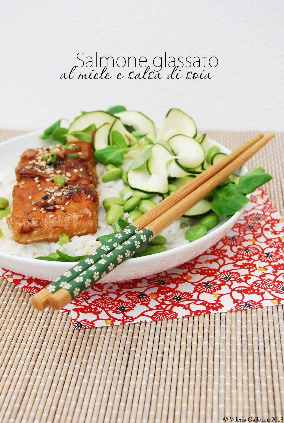 I tranci di salmone vengono marinati in una speciale miscela a base di miele, salsa di soia, aglio e cipollotto e poi passato in padella, così il cipollotto si caramella e la salsa diventa lucida e densa, dando vita ad un insieme di sapori meraviglioso.