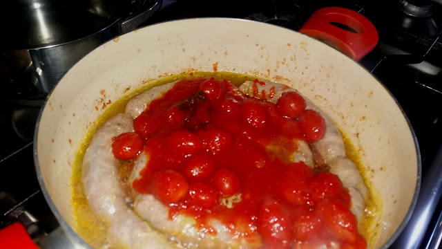 Rosolare ben bene le salsicce in olio e cipolla,unire i datterini salsati,salare e coprire,