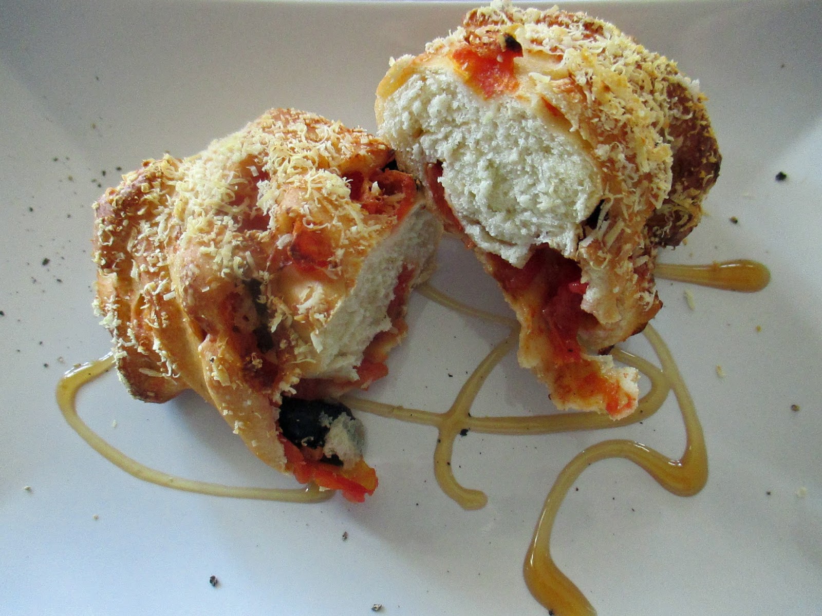 A great appetizer made with the dough used to make the cake (see recipe link). Inside I put tomatoes and black olives.