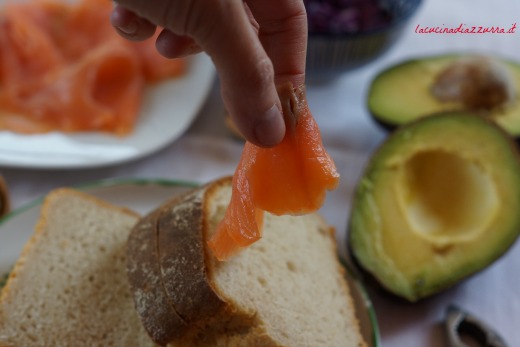 salmone, fettine di avocado, cavolo viola, limone strizzato sull’avocado sennò annerisce e una spennellata di formaggio morbido tipo robiola o philadelphia e gherigli di noci.