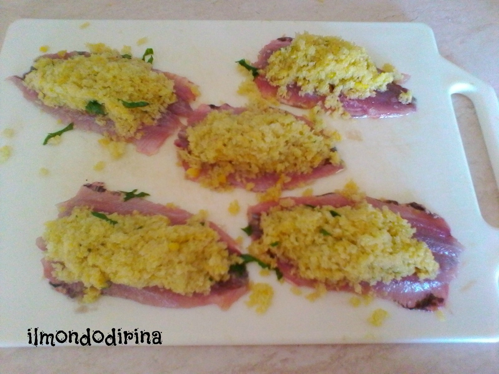 Preparate il ripieno: frullate in un robot da cucina il pane raffermo, uno spicchio d’aglio, prezzemolo, origano, un pizzico di peperoncino piccante in polvere e uno di sale. Trasferite il tutto in un contenitore e bagnatelo con un pò d’acqua, strizzate e amalgamate con un tuorlo d’uovo. Dovete ottenere un composto omogeneo. Adesso prendete un filetto di sarda, adagiate sopra un cucchiaio di ripieno , coprite con un altro filetto pressando un pò.