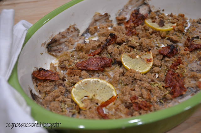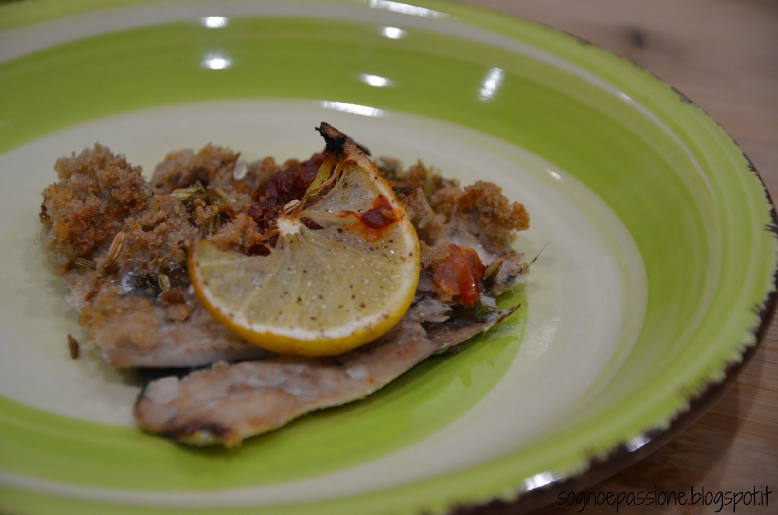 Tagliate i pomodori a fettine, come anche i limoni e condite le sarde con un trito fatto di pan grattato, scorze di limone i pomodori secchi e il finocchietto.