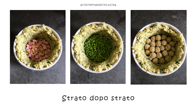 Lo strato interno di riso, l’ho omesso perchè la metà del mio ripieno era già molto oltre la metà del contenitore e volevo fare doppio strato di tutto. Comunque ha retto molto bene e le polpettine hanno sostenuto il ripieno al taglio della fetta.