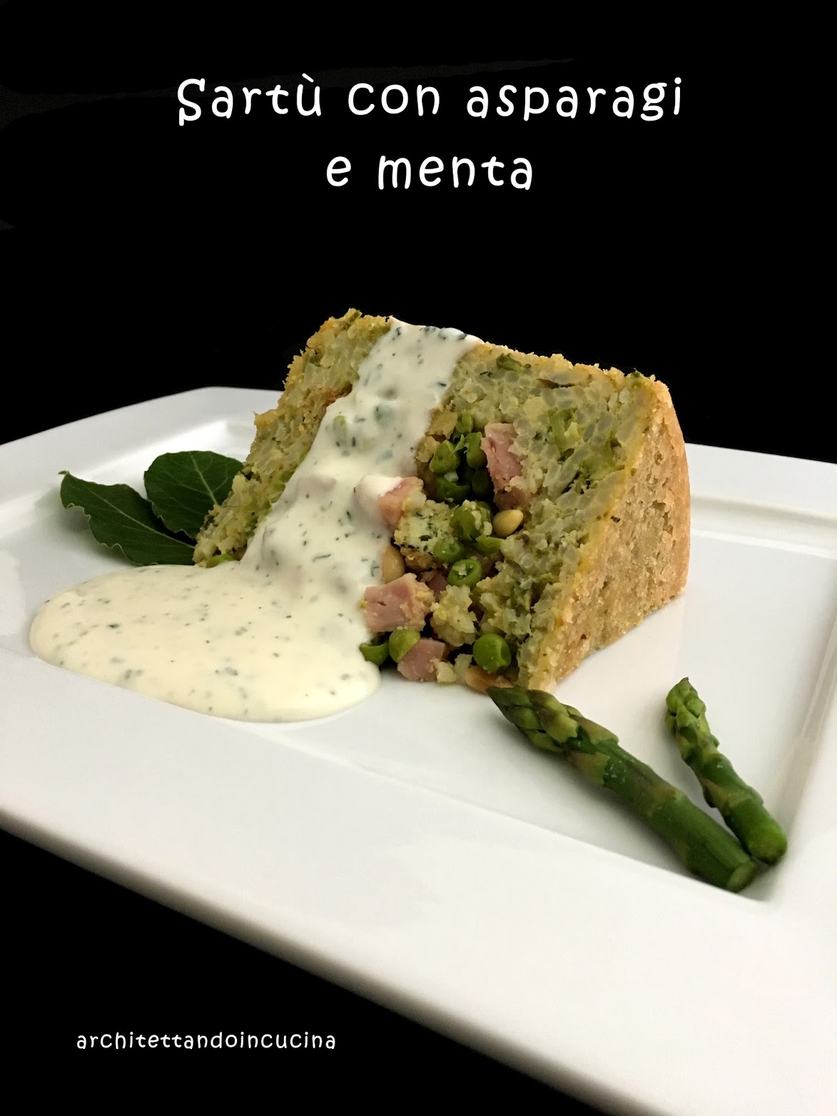 Sartù agli asparagi, polpettine di ricotta e basilico, prosciutto cotto artigianale, piselli e pinoli servito con besciamella profumata alla menta