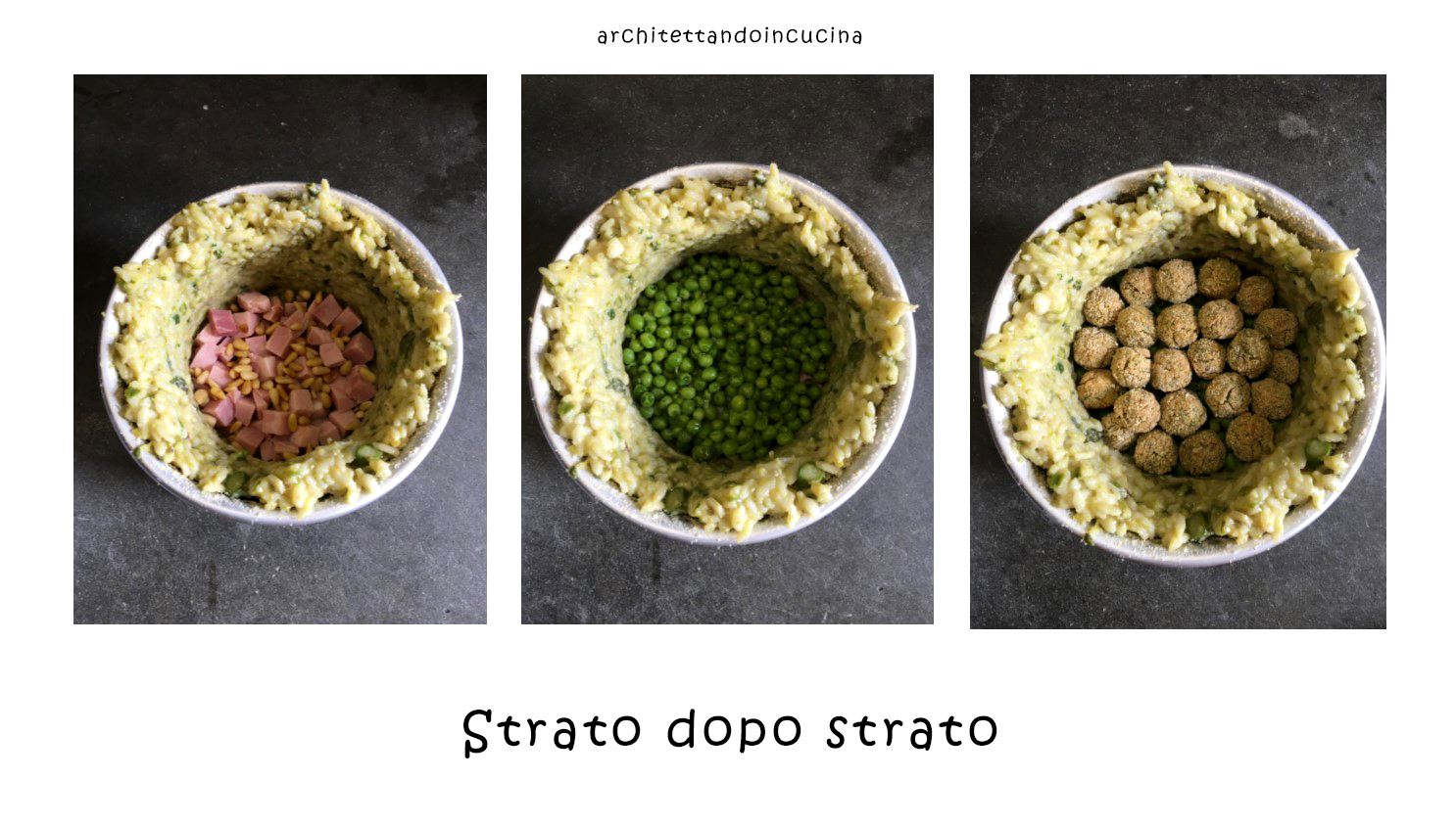Lo strato interno di riso, l’ho omesso perchè la metà del mio ripieno era già molto oltre la metà del contenitore e volevo fare doppio strato di tutto. Comunque ha retto molto bene e le polpettine hanno sostenuto il ripieno al taglio della fetta.
