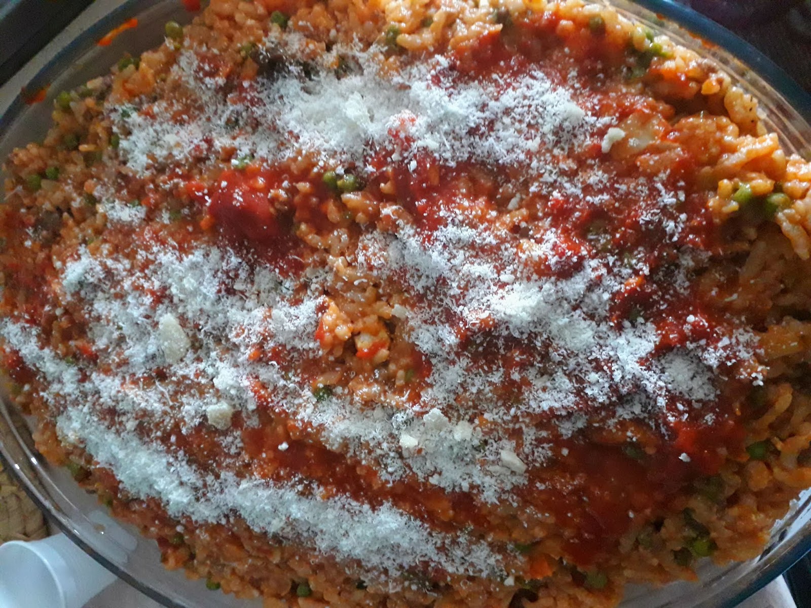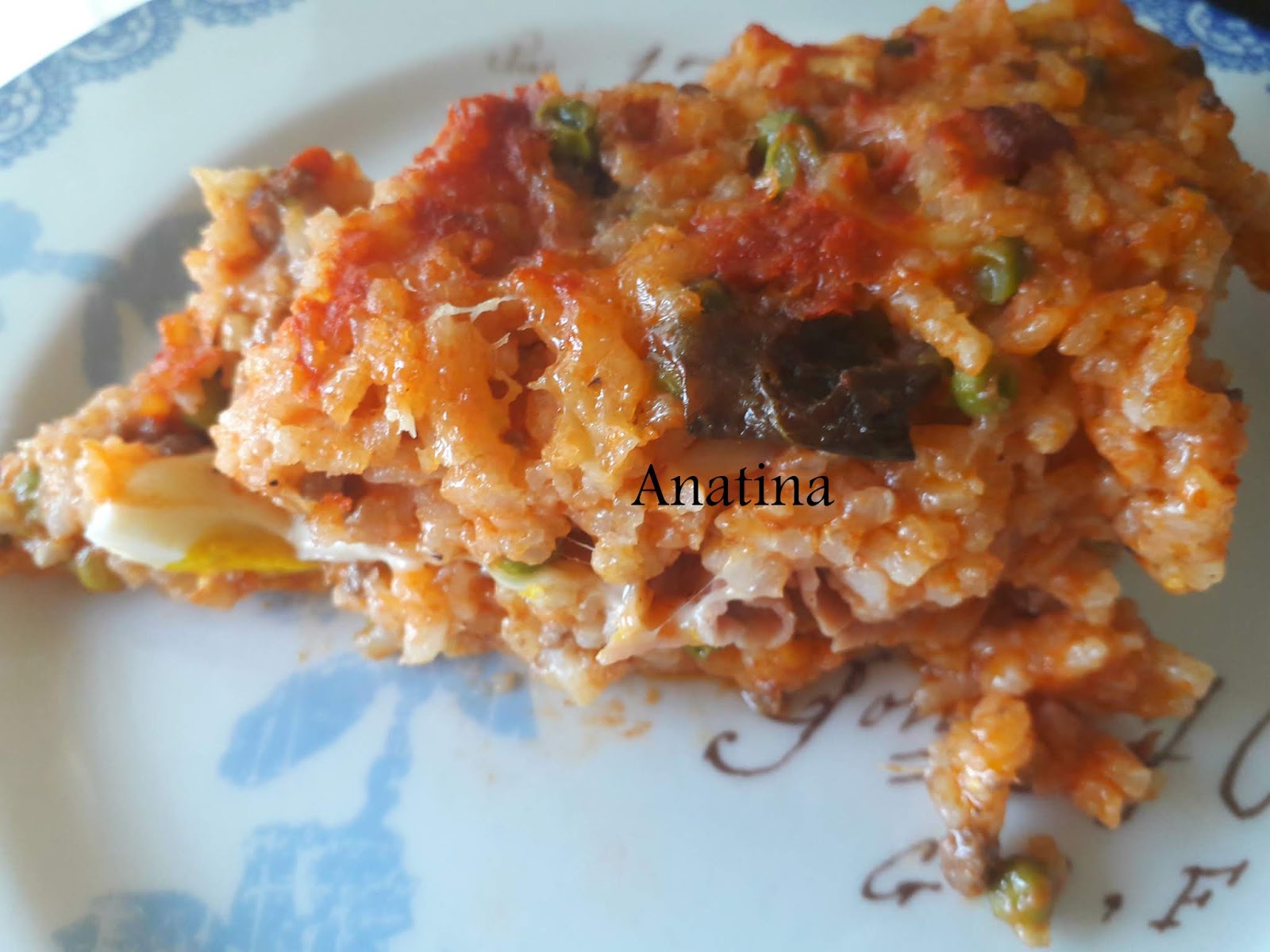 Versate il riso scolato in una capace insalatiera,unite parte di sugo con il macinato,il formaggio grattugiato ,i piselli ,le uova sbattute,il latte e mescolate il tutto,versatene meta’ in una capace teglia imburrata farcite con la provola ,il prosciutto cotto,le uova sode, ancora sugo e ricoprite con il restante riso e sugo, spolverate il tutto con il formaggio e pane grattugiato,qualche fiocchetto di burro