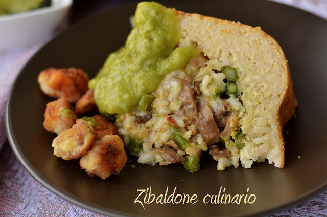 Servire il sartù con qualche polpetta sulla sommità e la salsa di asparagi a lato.