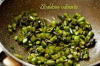 Scaldare in una padella 2 cucchiai di olio evo, soffriggere a fuoco basso uno scalogno tritato fine, dopo qualche minuto quando risulta quasi trasparente unire i tocchetti di asparagi , salare e pepare.