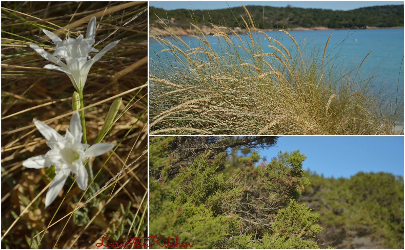 Fiori, gigli di mare, mi raccomando assolutamente da non toccare! perchè servono a mantenere l’equilibrio naturale delle dune di sabbia - cisto, ginestre, aglio selvatico, giunchi e pini.