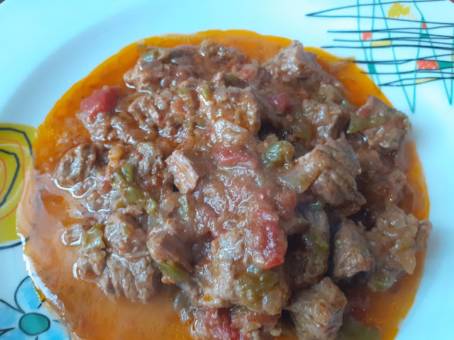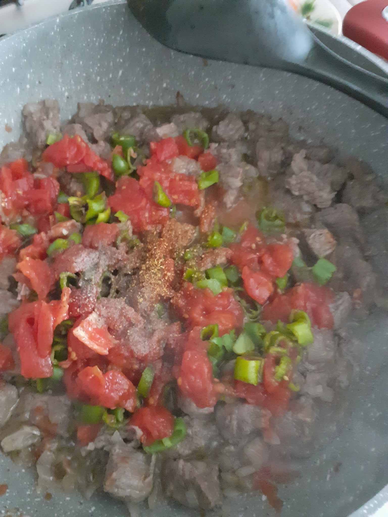 In padella,olio,cipolla, carne,peperoni a rosolare,coprire e lasciare asciugare,aggiungere poi i pomodori,spezie,sale,il concentrato,fare andare il tutto mescolando bene a fiamma viva e poi aggiungere i 2 bicchieri di acqua bollente,coprire e portare a cottura a fiamma media!