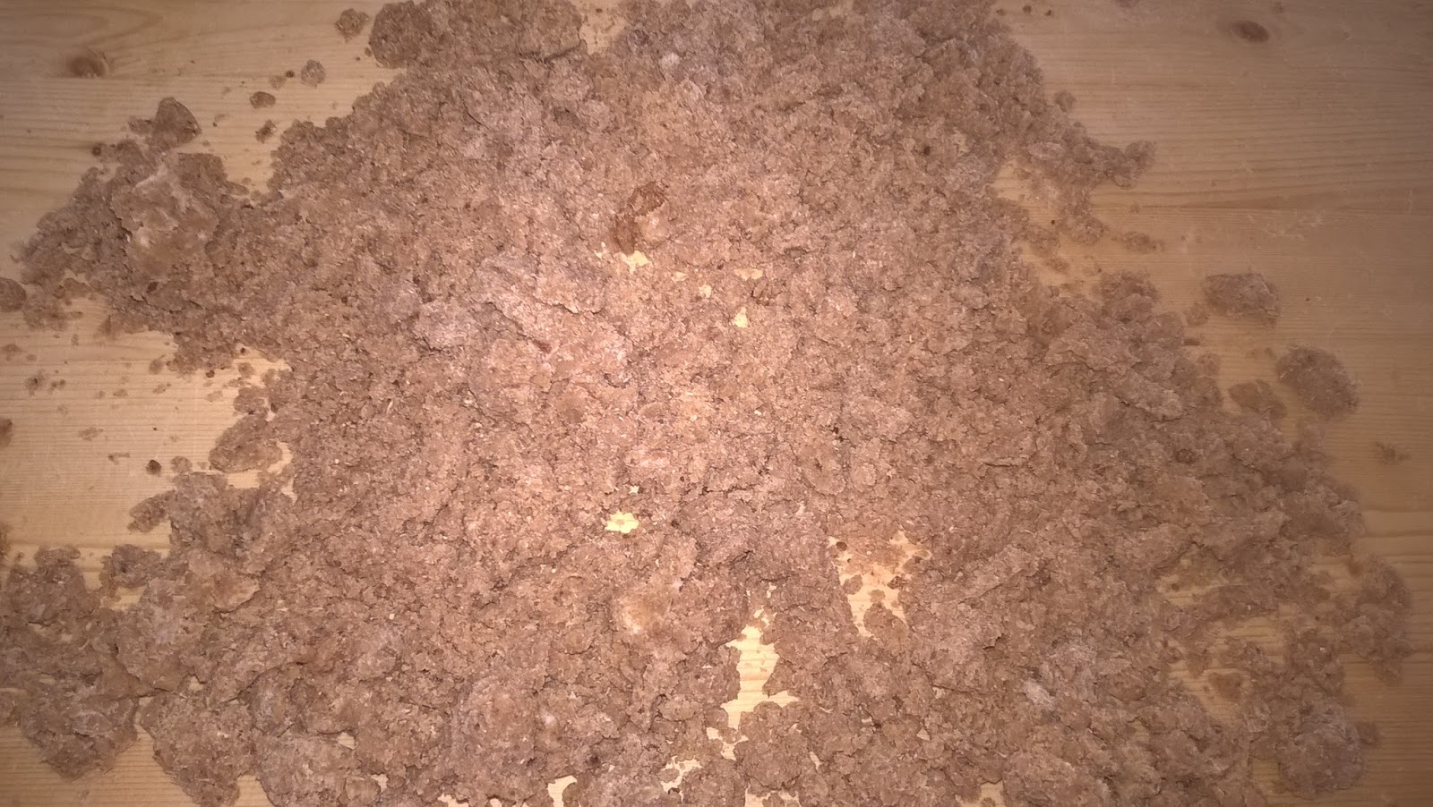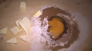 Per la sbriciolata: 200 g di farina 00 integrale, 100 g burro, 100 g zucchero di canna integrale, un tuorlo, 3/4 semi di cardamomo tritati, cannella e vaniglia.