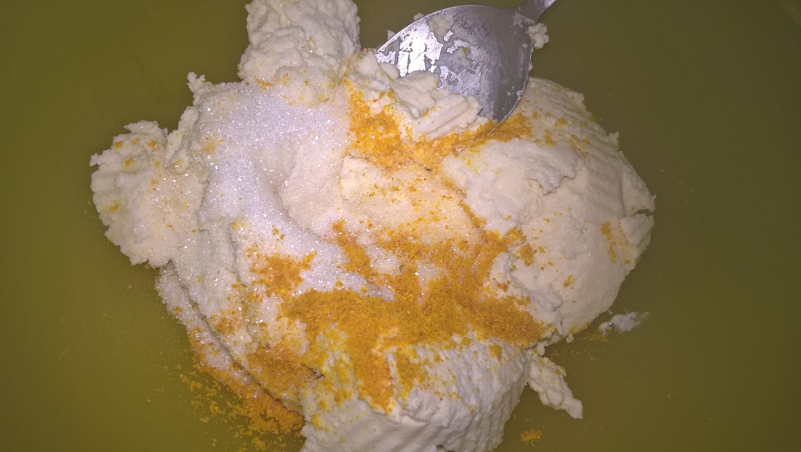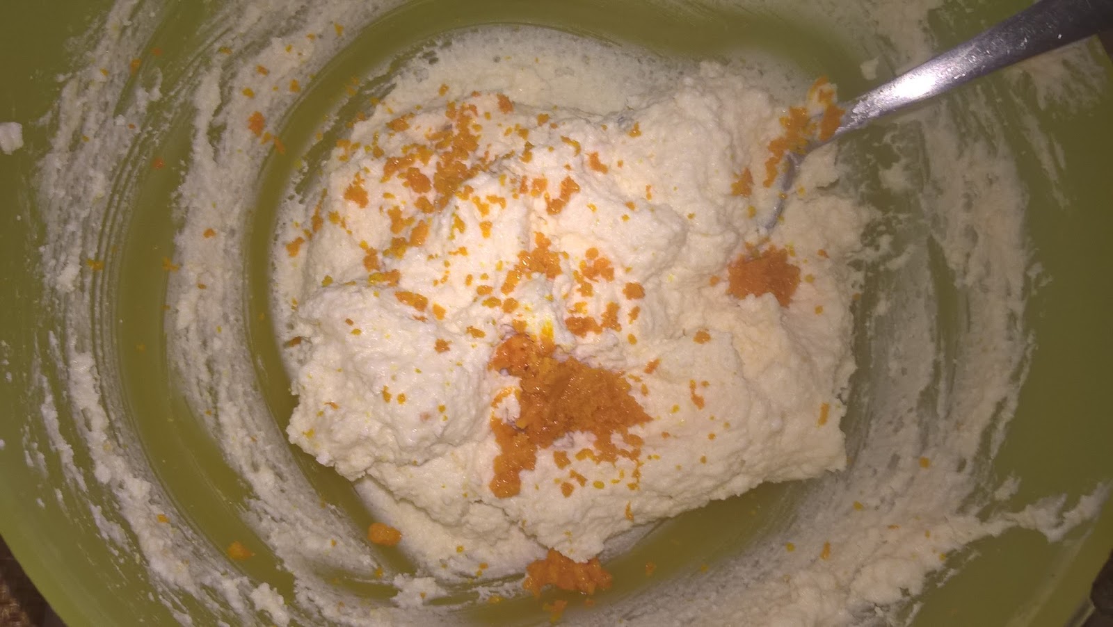 Lavorare 300 g di ricotta vaccina con 80 g di zucchero e polvere d’arancia.