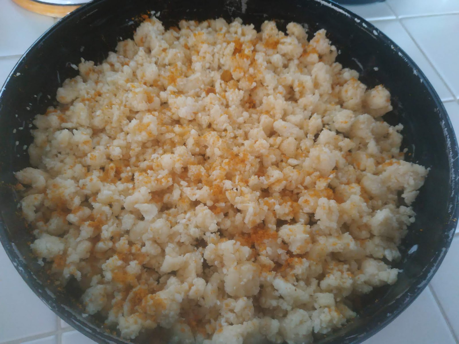 Impastate velocemente con le dita gli ingredienti fino ad ottenere delle grosse briciole. Prendete metà dell’impasto e appiattitelo sul fondo di una teglia, lasciando da parte quella restante per la copertura.