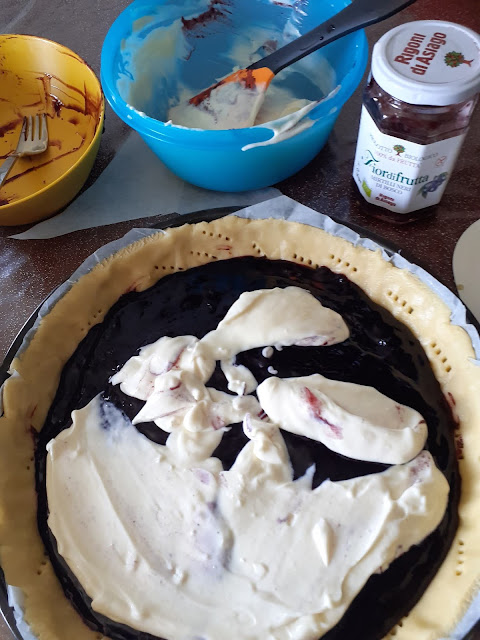 Ora riprendiamo la pasta e con una parte rivestiamo una teglia x crostata, spalmiamo