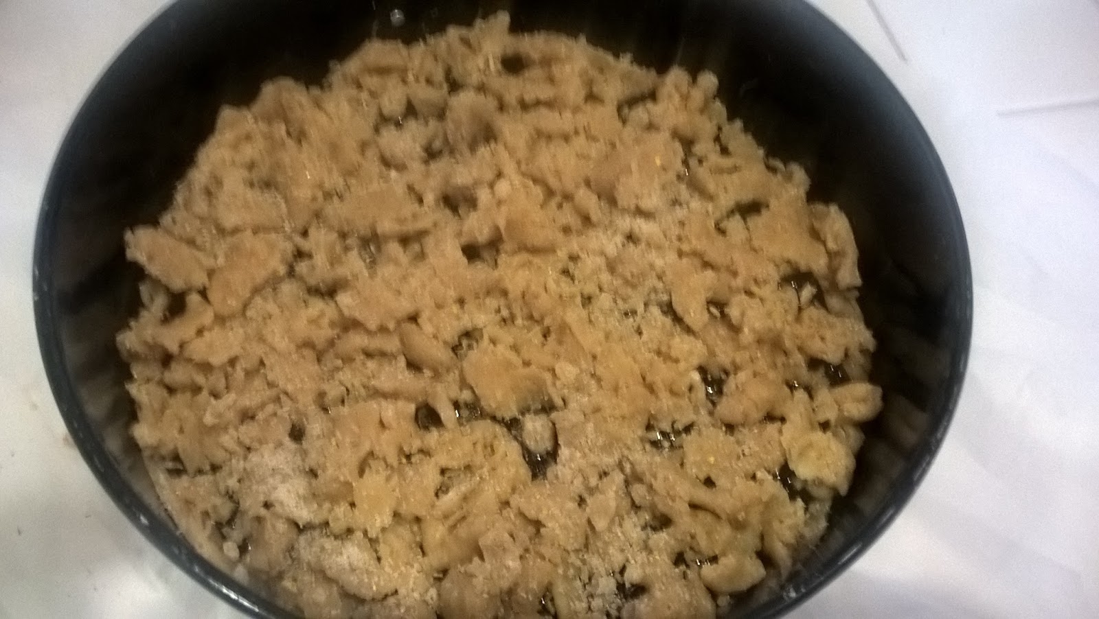 Sbriciolate la seconda porzione di frolla sulla confettura in modo da ricoprirla.