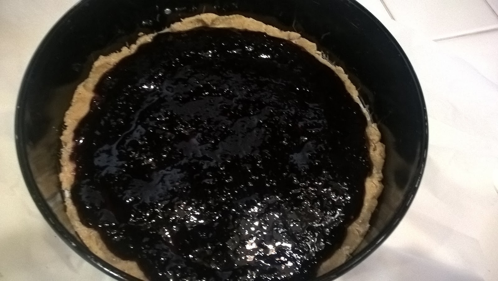 Riprendete la frolla, dividetela in due porzioni e schiacciate una parte sul fondo di una tortiera dal bordo a cerniera. farcite con uno strato di confettura di gelsi (ma potete scegliere qualsiasi altro frutto dal gusto leggermente acidulo, ad esempio agrumi o fragole).