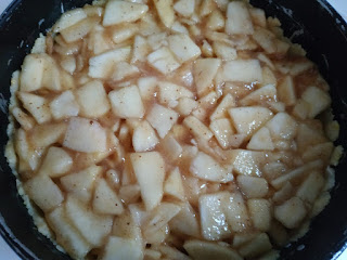 Per il ripieno: 2 grosse mele, cannella, buccia grattugiata di limone, 100 g di confettura di mele cotogne, succo di mezzo limone. Sbucciare le mele, tagliarle a cubetti, unire la confettura, il limone e la scorza e la cannella. Coprite con le briciole dell’impasto avanzato.