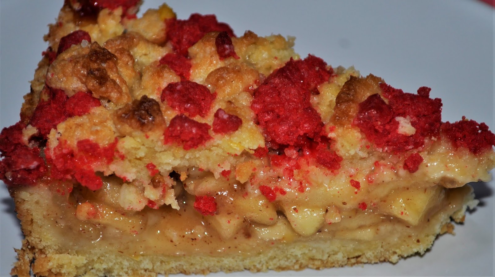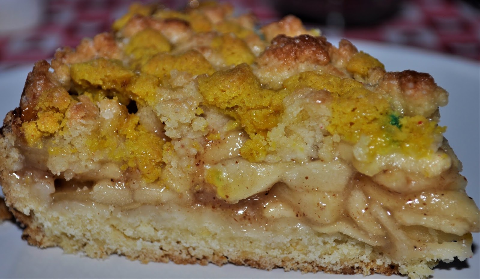 Per il ripieno: 2 grosse mele, cannella, buccia grattugiata di limone, 100 g di confettura di mele cotogne, succo di mezzo limone. Sbucciare le mele, tagliarle a cubetti, unire la confettura, il limone e la scorza e la cannella. Coprite con le briciole dell’impasto avanzato.
