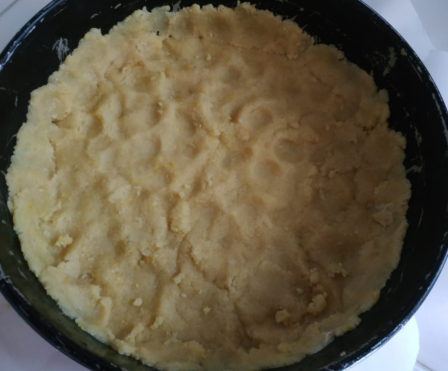 Per l’impasto della sbriciolata: 250 g farina 00, 100 g zucchero semolato, 1 uovo, 120 g burro, vaniglia, sale, 1 cucchiaino di lievito. Impastare velocemente con le mani ottenendo delle briciole grossolane. Sistemare metà dell’impasto sul fondo di una tortiera compattando con le mani.