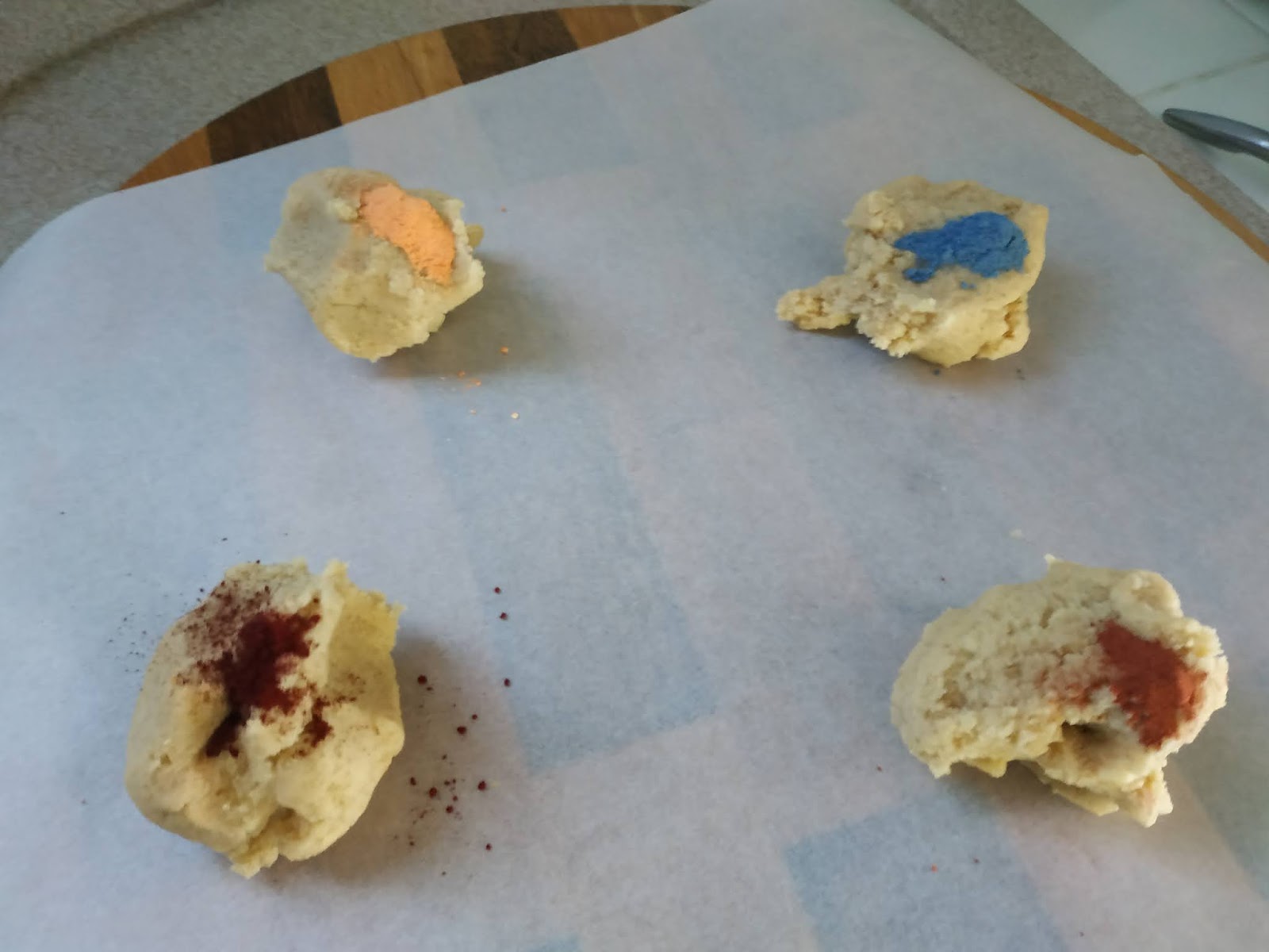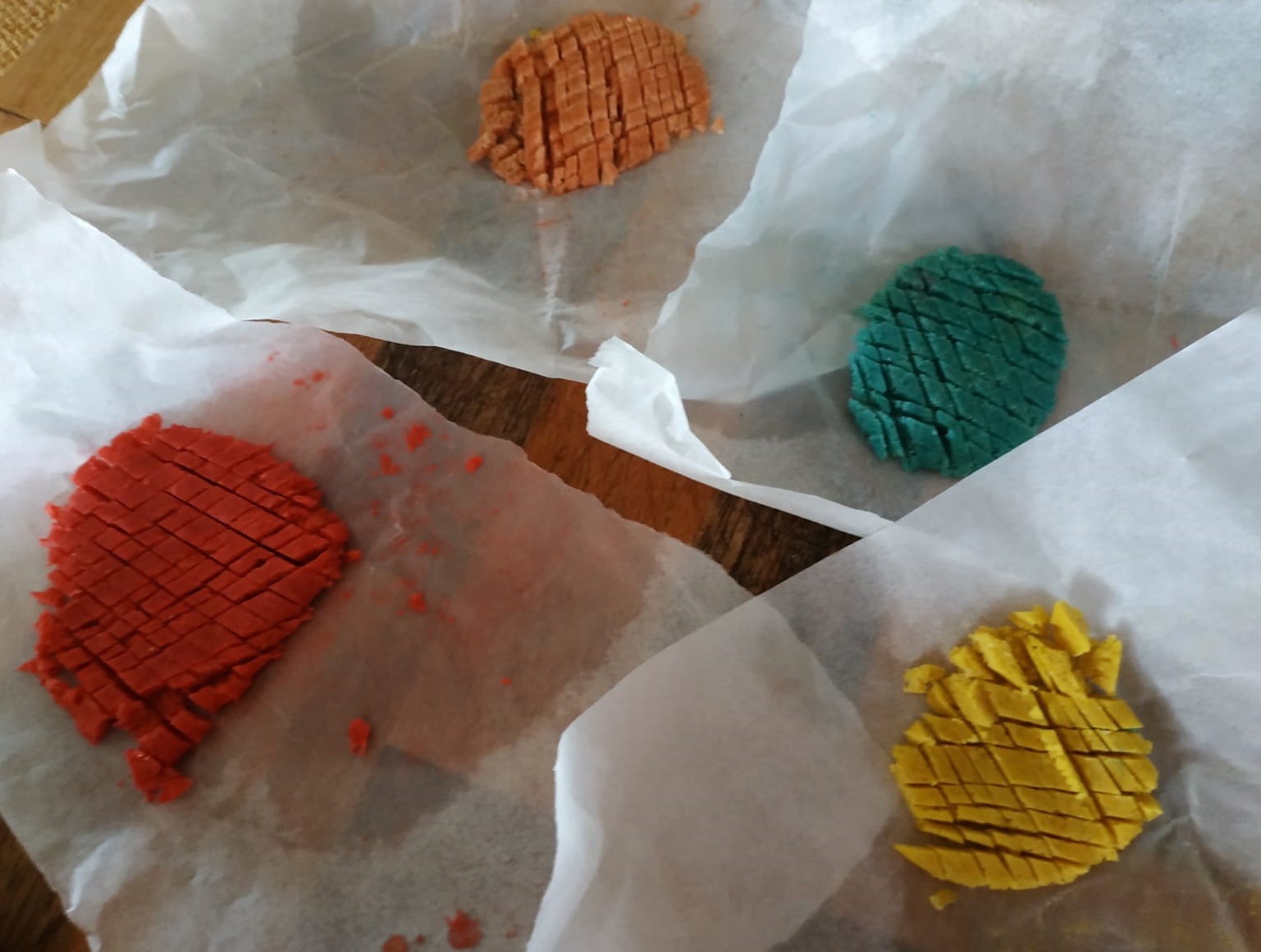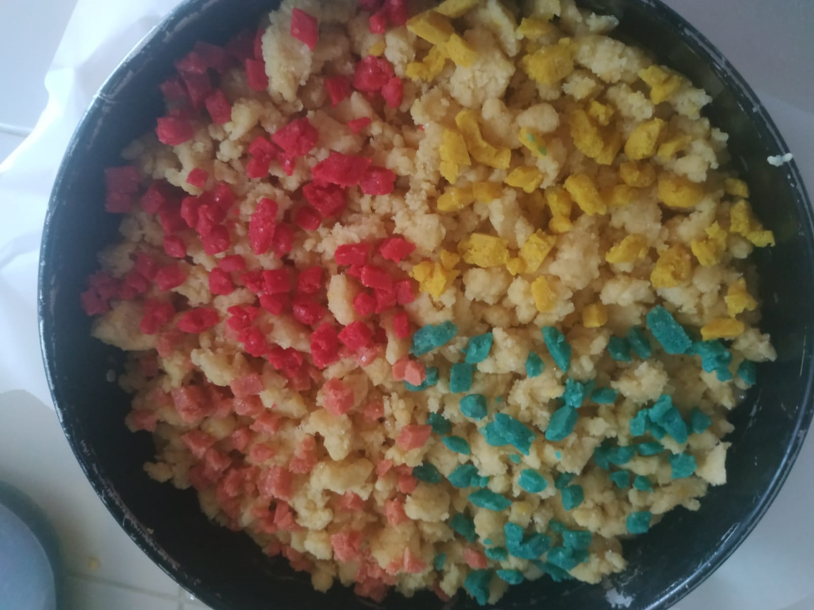 Prepariamo ora il craquelin che ci servirà per decorare la crostata: serviranno 80 g di zucchero, 80 g di farina 00, 60 g di burro. Impastare velocemente gli ingredienti, quindi suddivideteli in 4 porzioni: ad ognuna aggiungerete un pizzico di coloranti per alimenti; avvolgete gli impasti in carta da forno e mettete in frigo. Aiutatevi con la lama di un coltello per ricavare dei piccoli frammenti con cui andrete a completare la superficie della torta.