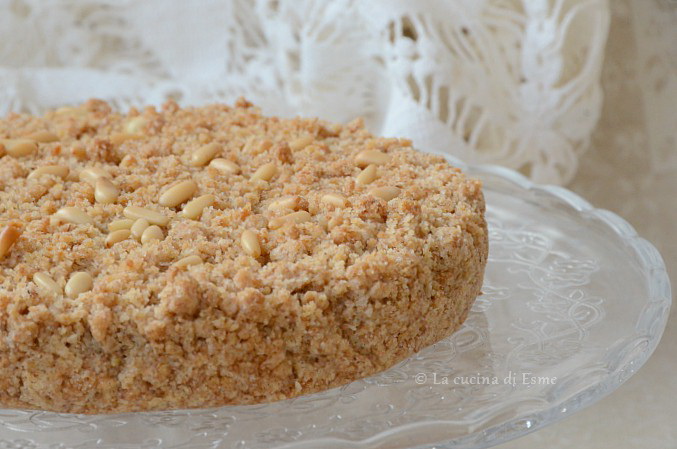 Per prima cosa preparate la crema. Mettete il latte sul fuoco insieme alla buccia di limone e fatelo intiepidire. In un pentolino mescolate, con una frusta a mano, i tuorli con lo zucchero fino a farli diventare spumosi, poi aggiungete la fecola e mescolate ancora. A questo punto iniziate ad aggiungere a filo il latte caldo. Poi mettete sul fuoco e portate ad ebollizione, appena accenna a bollire spegnete, levate la buccia del limone, versate la crema in una ciotola di vetro e copritela a contatto con della pellicola trasparente. Nel frattempo preparate la pasta frolla. Sciogliete il burro sul fuoco o nel micro e lasciatelo raffreddare. In una ciotola unite la farina setacciata con il lievito e lo zucchero e mescolando, semplicemente con una forchetta, unire il burro sciolto e ormai freddo. Poi aggiungete l’essenza di vaniglia e le uova leggermente battute, amalgamate passando a lavorare l’impasto direttamente con le mani, otterrete così delle grosse briciole. Con una parte delle briciole, più o meno 3/4, ricoprite il fondo di una tortiera apribile rivestita di carta forno, premete un poco per compattare bene la base del dolce, quindi distribuite su questa base la crema, lasciano pochissimo bordo della circonferenza scoperto. Ricoprite la farcia con le briciole rimaste cospargendole su tutta la superficie formando uno strato piu sottile e meno compatto di quello della base. Distribuite sulla superficie del dolce alcuni pinoli e infornate a 180° in modalità statico per 35 minuti. (gli ultimi 5/8 minuti scendete la griglia di una tacca e passate a 190° con calore da sotto). Sfornate e lasciate raffreddare totalmente il dolce prima di rimuoverlo dallo stampo, è molto delicato e potrebbe rischiare di rompersi. Si conserva, sotto la classica campana di vetro, ottimamente per tre giorni.
