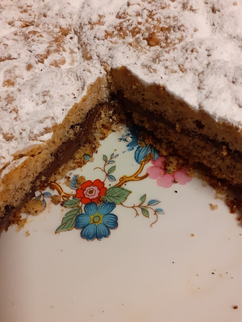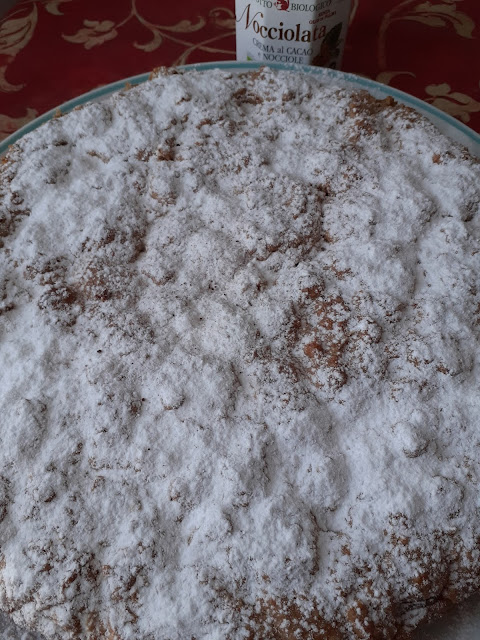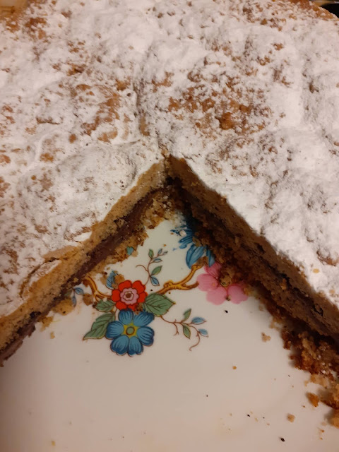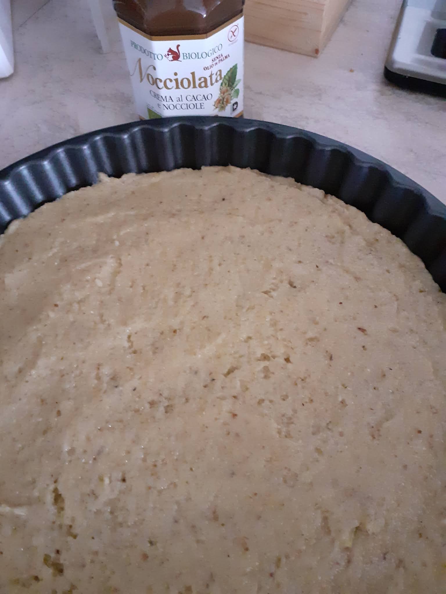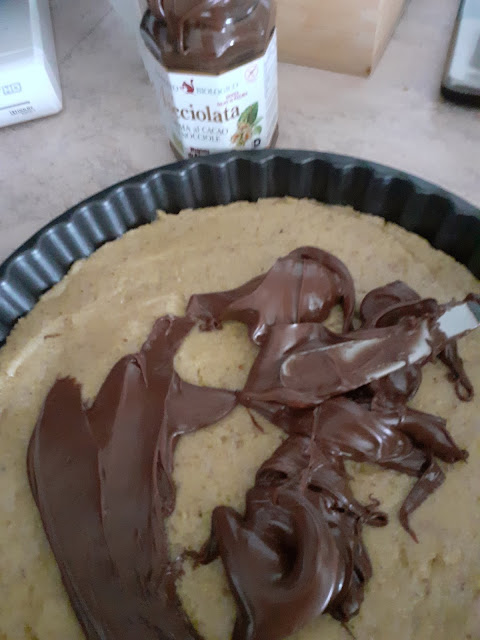 mescolare velocemente e con meta’ dose foderare una teglia,farcire con la nocciolata e terminare