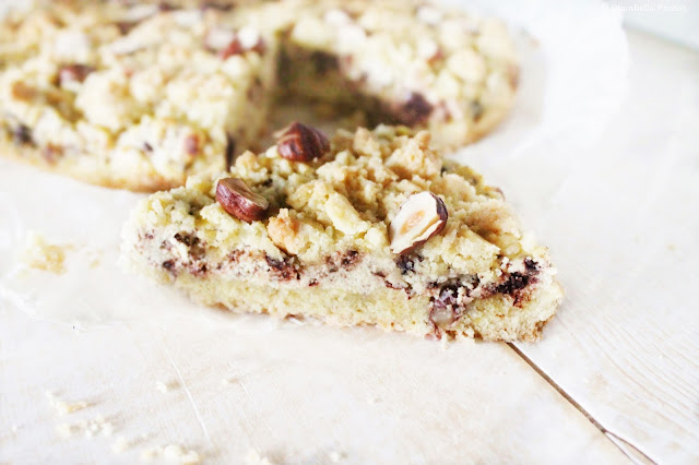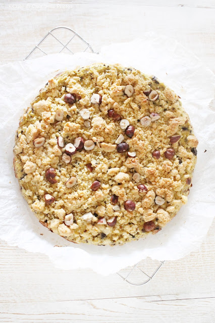 In una terrina unire le farine, lo zucchero e il sale e omogeneizzare con un cucchiaio. Unire il burro fuso e iniziare a impastare con le mani, unire poi l’uovo e continuare fino ad ottenere delle grosse briciole. Ricoprire la tortiera con carta forno e creare la base con 3/4 delle briciole. Preparare il ripieno tritando il cioccolato grossolanamente e unirlo alla ricotta, alle uova, 2/3 delle nocciole e se gradite potete unire dello zucchero. Stendere il composto di ricotta sulla base e ricoprire con le restanti briciole e per ultimo le nocciole tritate avanzate. Cuocere in forno già caldo a 180°C per circa 35 minuti. Gli ultimi cinque minuti di cottura io consiglio di farli mettendo la tortiera nella parte bassa del forno.