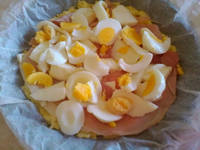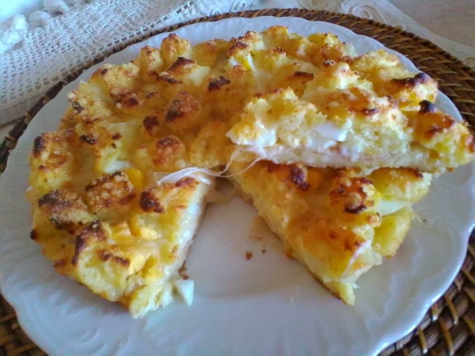 Lessate le patate in abbondante acqua salata e poi passatele allo schiacciapatate. Versate la purea in una ciotola e impastatela con le uova, il parmigiano e la farina messa poco alla volta. Dovete ottenere un impasto un poco appiccicoso. Foderate una tortiera con carta forno e con le mani inumidite formate un guscio con una parte dell’impasto. Adagiate le fette di prosciutto cotto, la provola e le uova tagliate a spicchi.