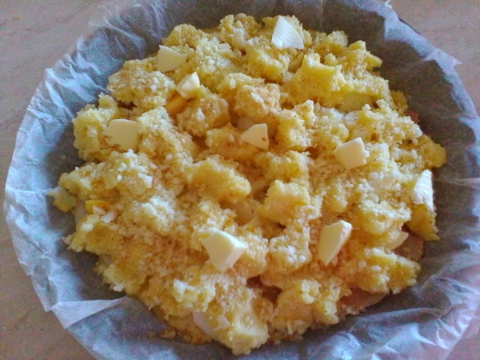 Coprite il tutto con il resto dell’impasto spezzettato in grosse briciole. Spolverate la superficie con il pangrattato e aggiungete dei riccioli di burro.