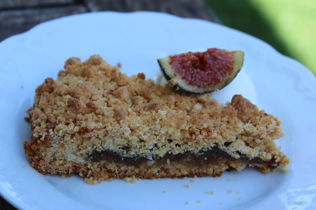 Sul fondo dello stampo stendere uno strato di briciole di 1 cm circa stendereuno strato di fichi caramellati scolati dal loro sciroppo, lasciando libero un cm di bordura tutta intorno, ricoprire con uno strato di briciole e cuocere in forno caldo per 40′ circa.