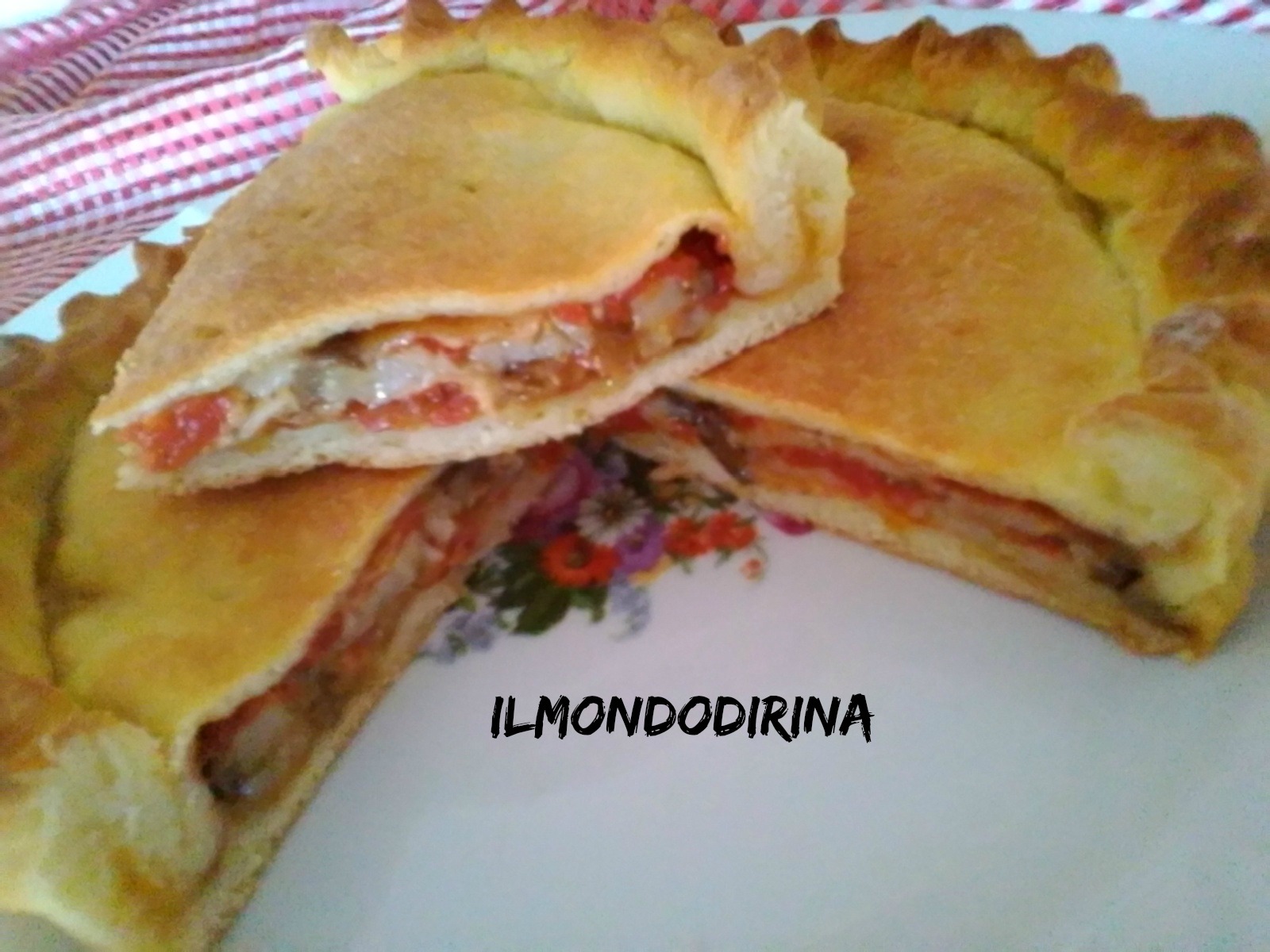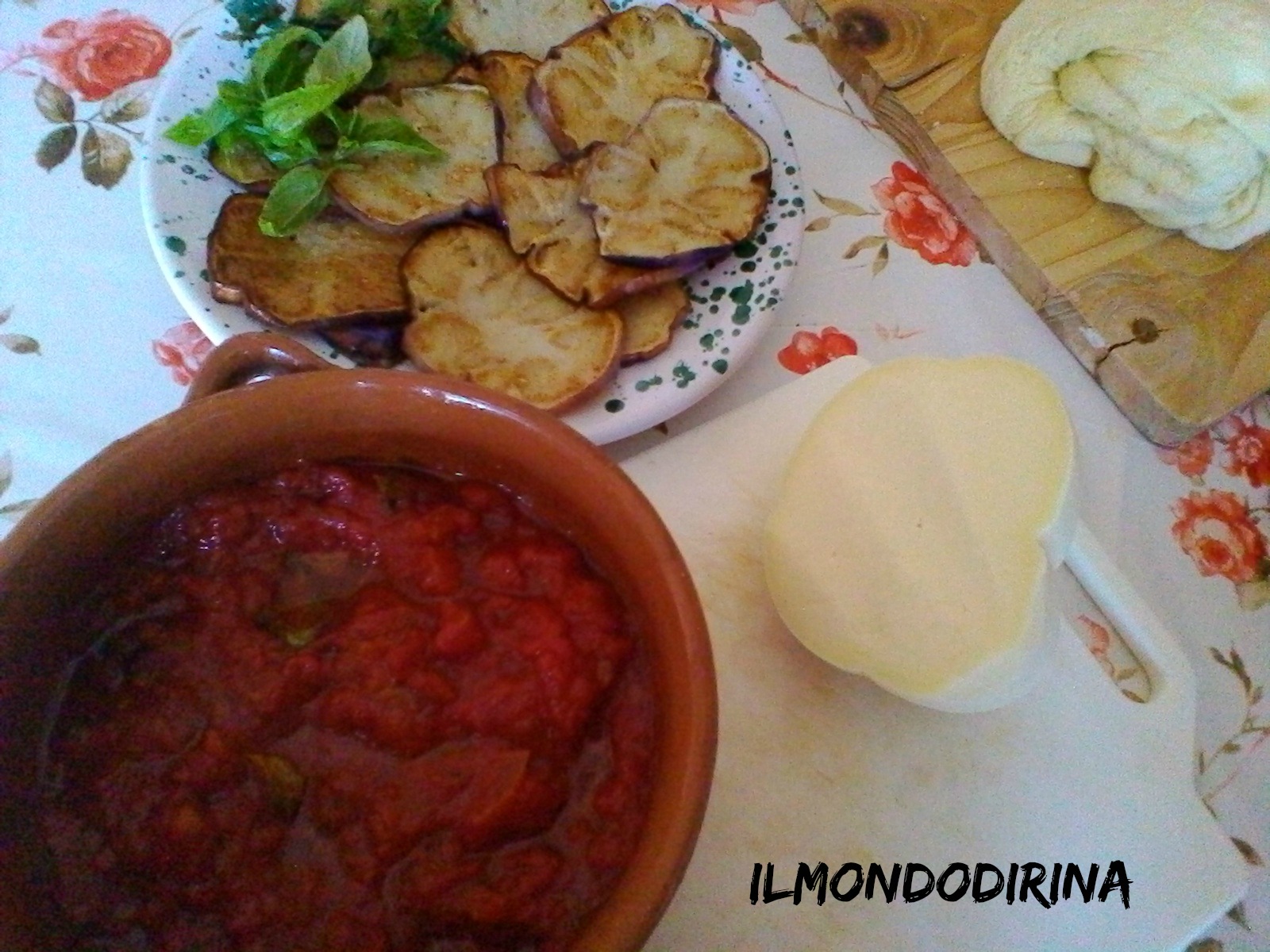 Per il ripieno: melanzane ( quantità necessaria per formare due strati in una tortiera da 24 cm ), polpa di pomodoro, concentrato di pomodoro, provola fresca, caciocavallo grattugiato ( io pecorino ), basilico, olio evo, una cipolla, olio di semi per friggere, farina per impanare.