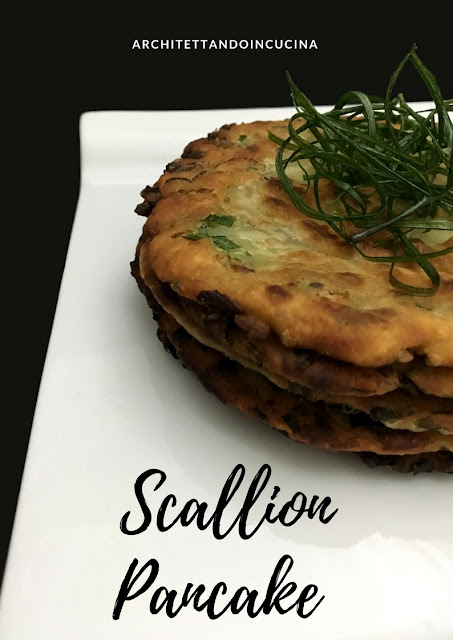 Questi pancake sono un cibo da strada come la nostra piadina, ma non richiedono nessun accompagnamento, sono buonissimi anche da soli. Di solito li servo come aperitivo: sono molto pratici, li preparo e li cuocio all’ultimo momento. Li servo caldi tagliati in 4 e guarniti con il verde del cipollotto fritto.