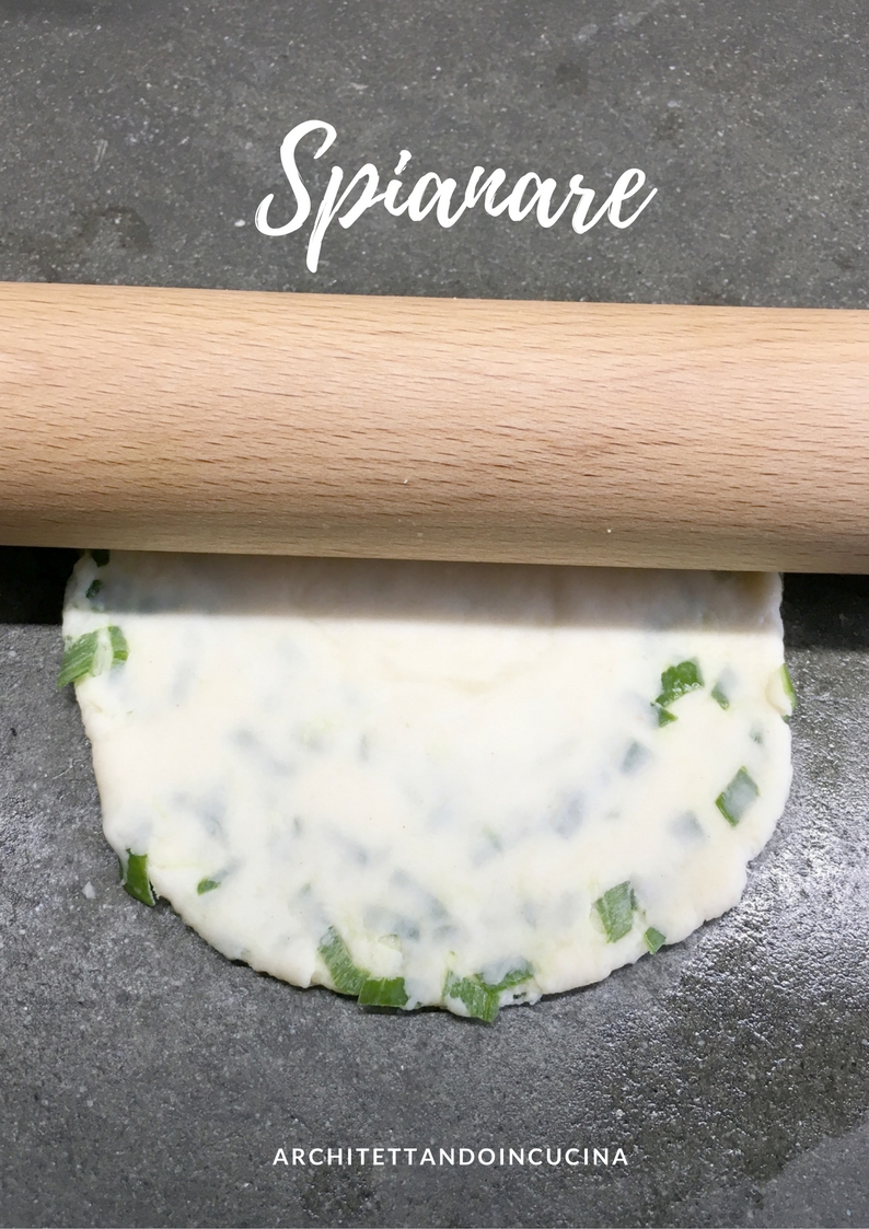 Spianarlo di nuovo in cerchio con il matterello e cospargere la superficie con le foglie di cipollotto tritate.