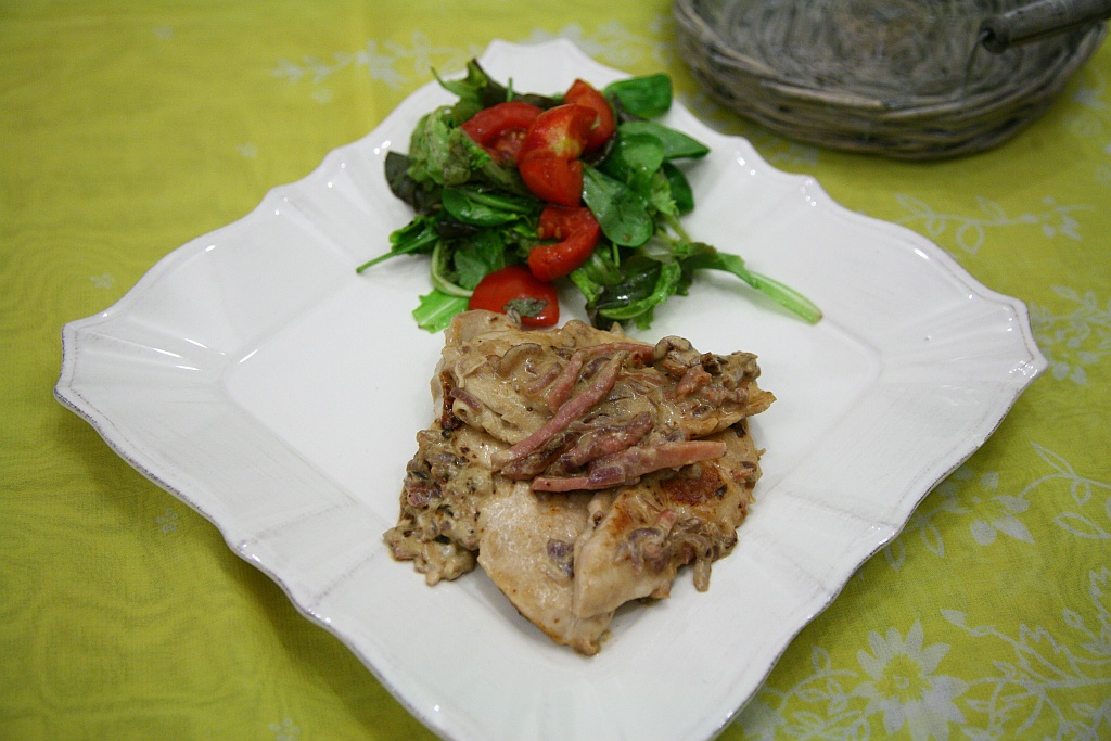 Dopo 10 minuti aggiungere le fettine di pollo e rosolarle a fiamma alta. Sfumare con il vino, regolare di sale, abbassare la fiamma e cuocere per 5 minuti con il coperchio.