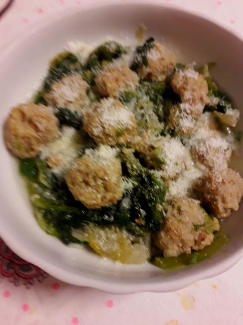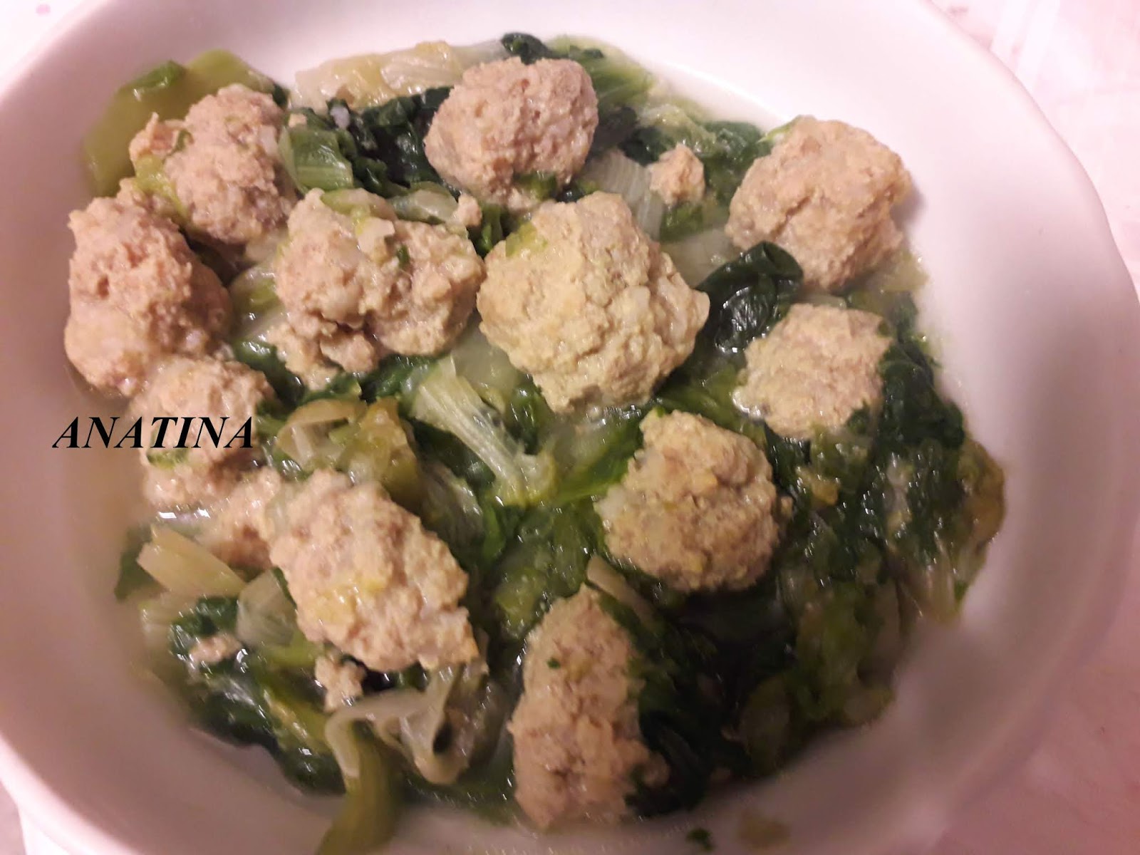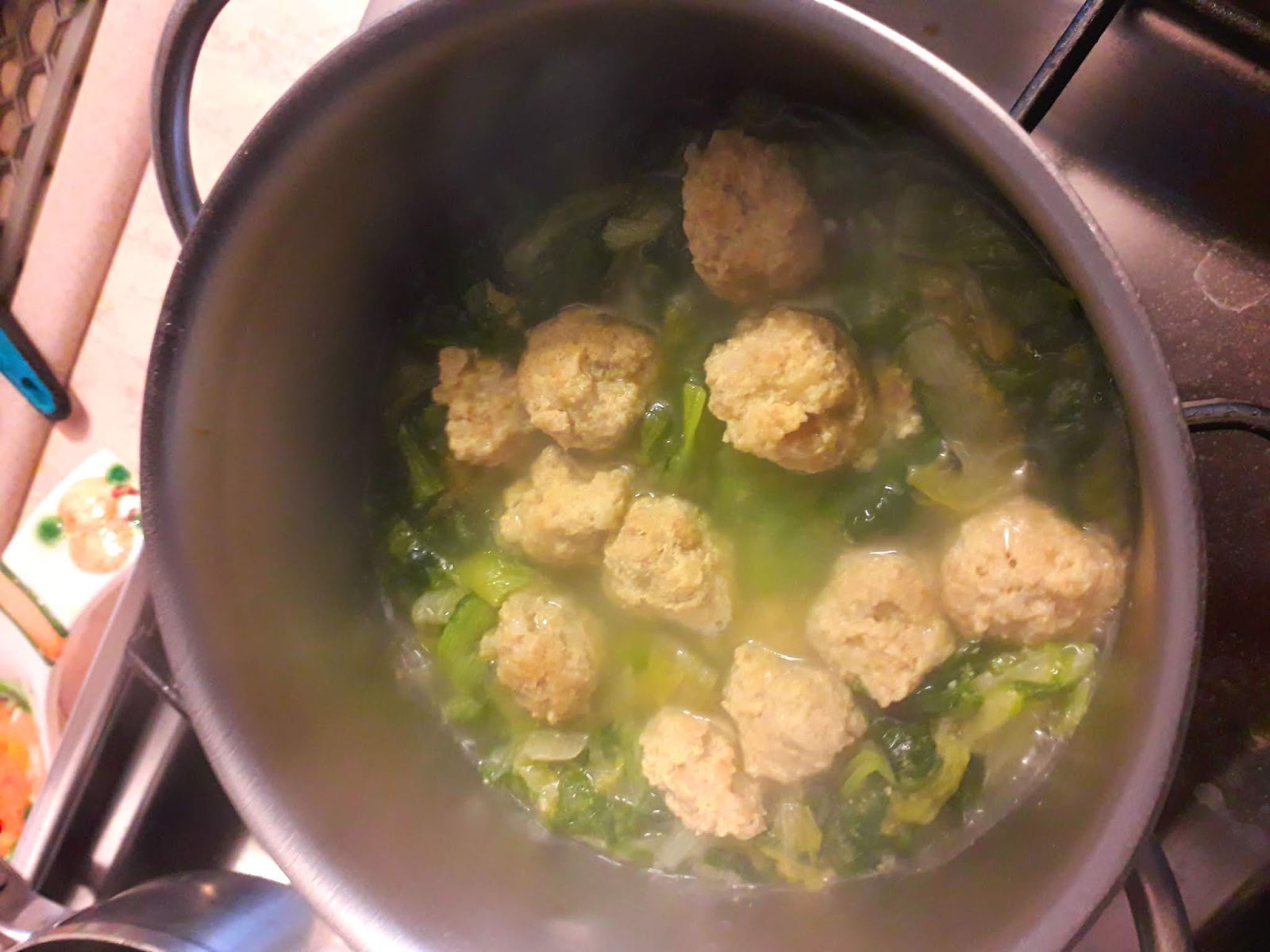aggiungere le scarole ed un pizzico di gomasio per terminarne la cottura ,infine unire le polpettine,l’olio