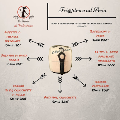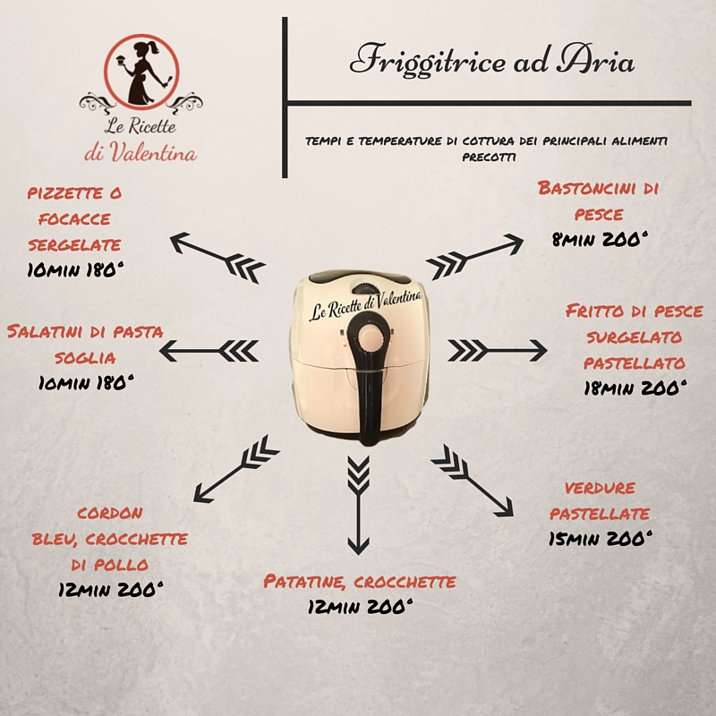 Schema riassuntivo dei tempi di cottura per i principali cibi precotti da cucinare nella friggitrice ad aria, utile come specchietto promemoria da stampare e tenere nel vostro ricettario o appeso in cucina.